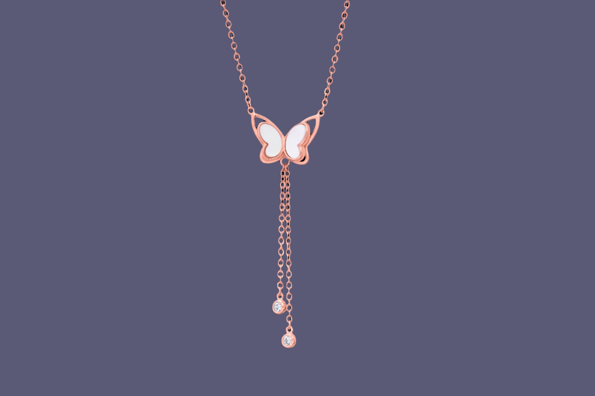 The image shows a delicate and elegant necklace designed with a rose gold finish. The centerpiece of the necklace is a butterfly-shaped pendant, featuring a smooth white inlay that adds a soft, feminine touch. Hanging from the bottom of the butterfly are three fine chains of varying lengths, each ending with a small round white gemstone, possibly diamonds or cubic zirconia, adding a graceful sparkle and movement to the piece.