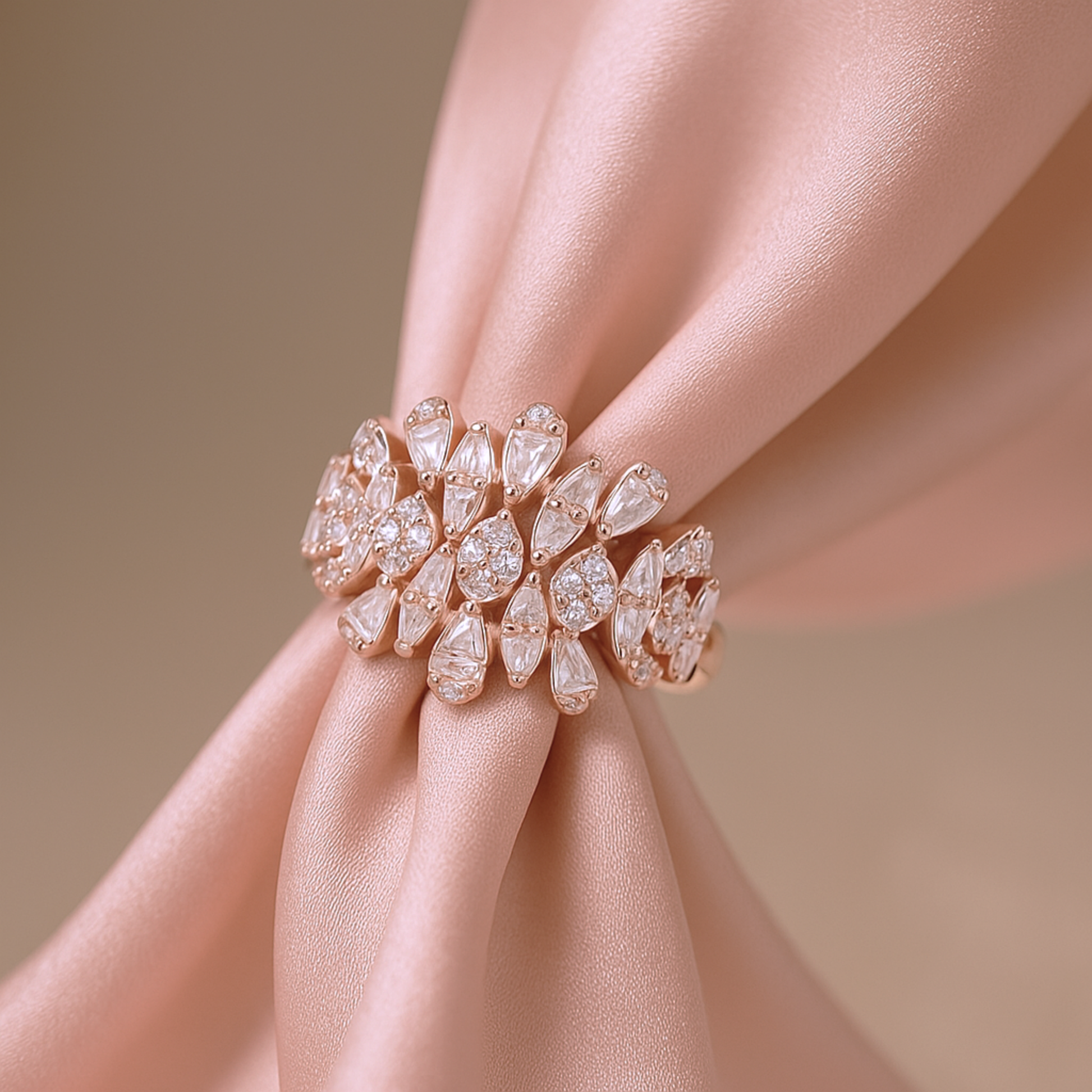 A refined rose gold ring adorned with a cascading cluster of shimmering stones for graceful sparkle