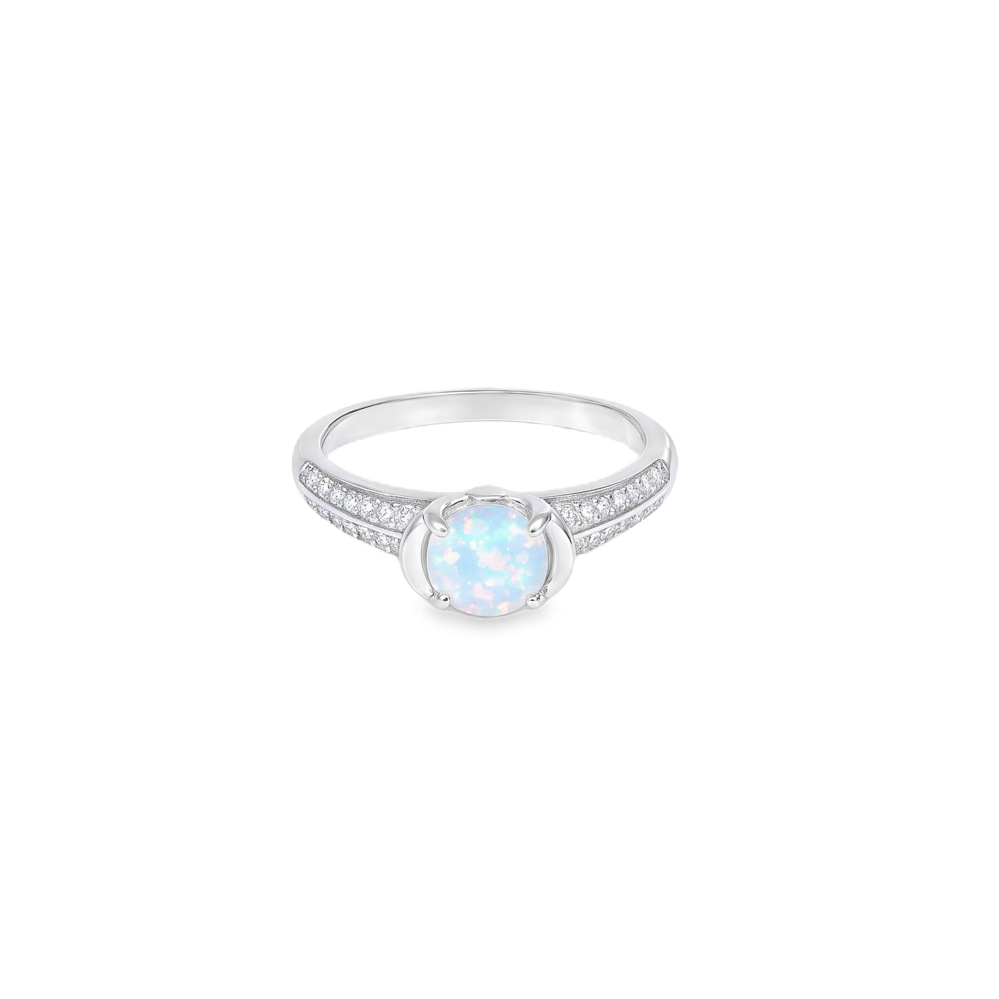 Elegant silver ring featuring a round opal center stone with soft iridescent hues, accented by delicate diamond detailing on the band